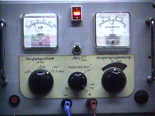 Mein Gesellenstück aus dem Jahre 1968. Das Gerät ist eine Gleichspannungsquelle mit einstellbarer Ausgangsspannung (0 bis 20 Volt) und Strombegrenzung (0,05 bis max. 1 Ampere). Die Transistoren sind, die zu dieser Zeit vorhandenen, Germaniumtransistoren. |